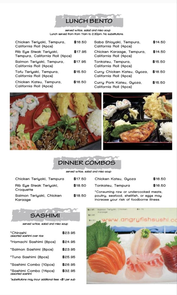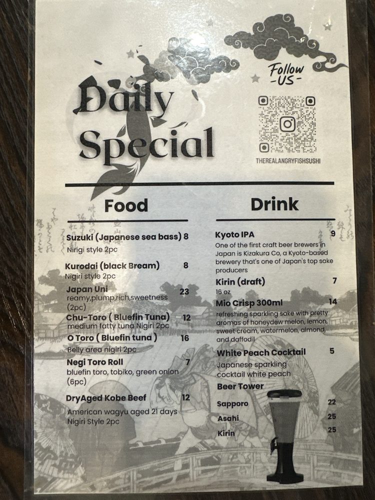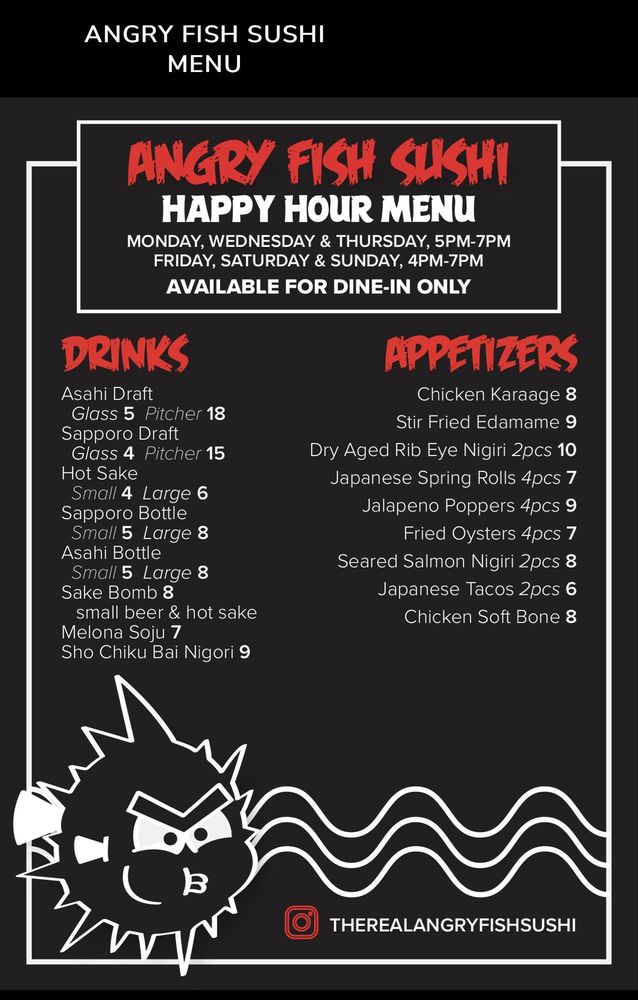 Introducing Angry Fish Sushi, a restaurant in San Leandro, CA, that offers a diverse menu with a focus on fresh and flavorful sushi dishes. The brand stands out for its vegan and limited vegetarian options, as well as its casual and inclusive atmosphere. From appetizers like Agedashi Tofu and Chicken Kaarage to Angry Chef Specials like Ahi Tower and Angry Spoon, there is something for every sushi enthusiast. The location offers various utilities, including takeout, delivery, and catering services, making it convenient for customers. With positive reviews highlighting the quality of the food and attentive service, Angry Fish Sushi is a go-to spot for sushi lovers looking for a satisfying dining experience.